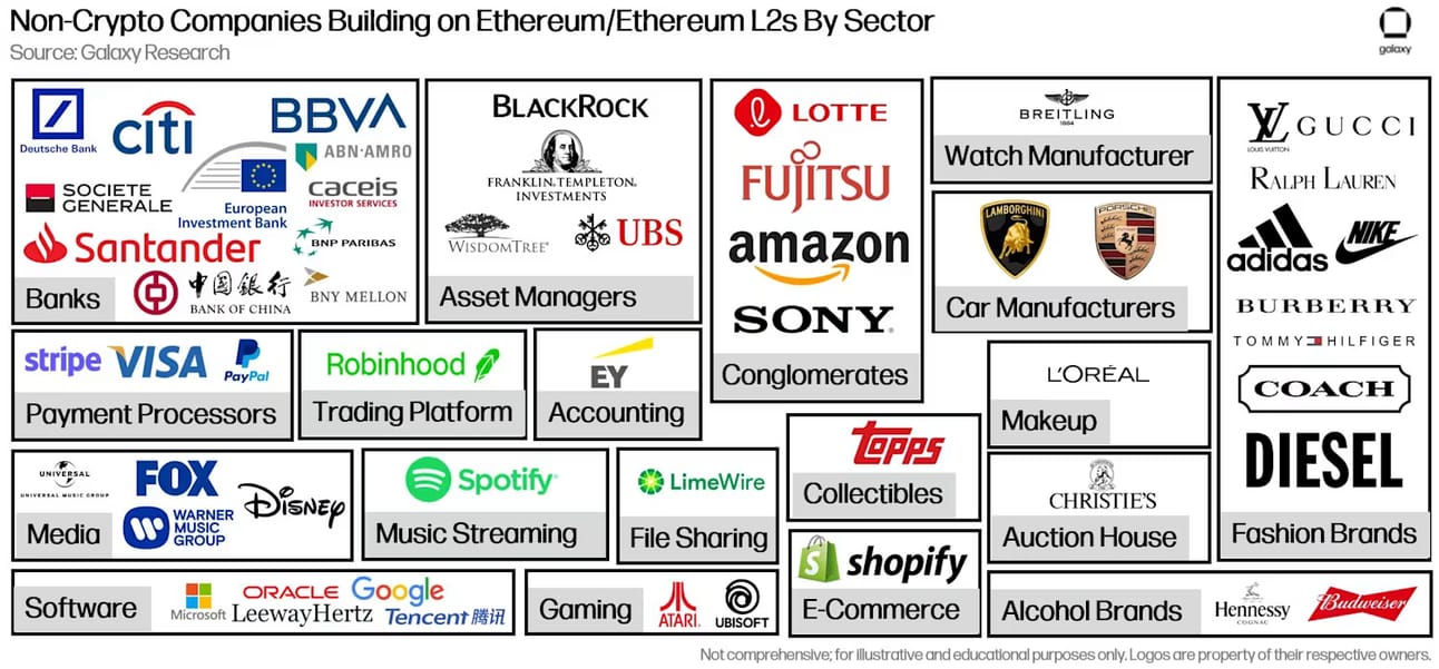 One of the most common types of non-crypto company building in the Ethereum ecosystem are financial institutions like banks, asset managers, payment processors, trading platforms, and accounting firms.
