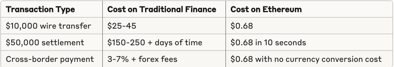For high-value transactions, Ethereum’s fees become vanishingly small as a percentage of the transaction amount. Moreover, these transactions settle in minutes rather than days, with no intermediaries or counterparty risk beyond the protocol itself.