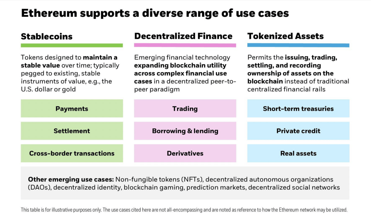 BlackRock, for instance, describes Ethereum to its clients as an essential infrastructure enabling stablecoins, decentralized finance, and tokenized assets.