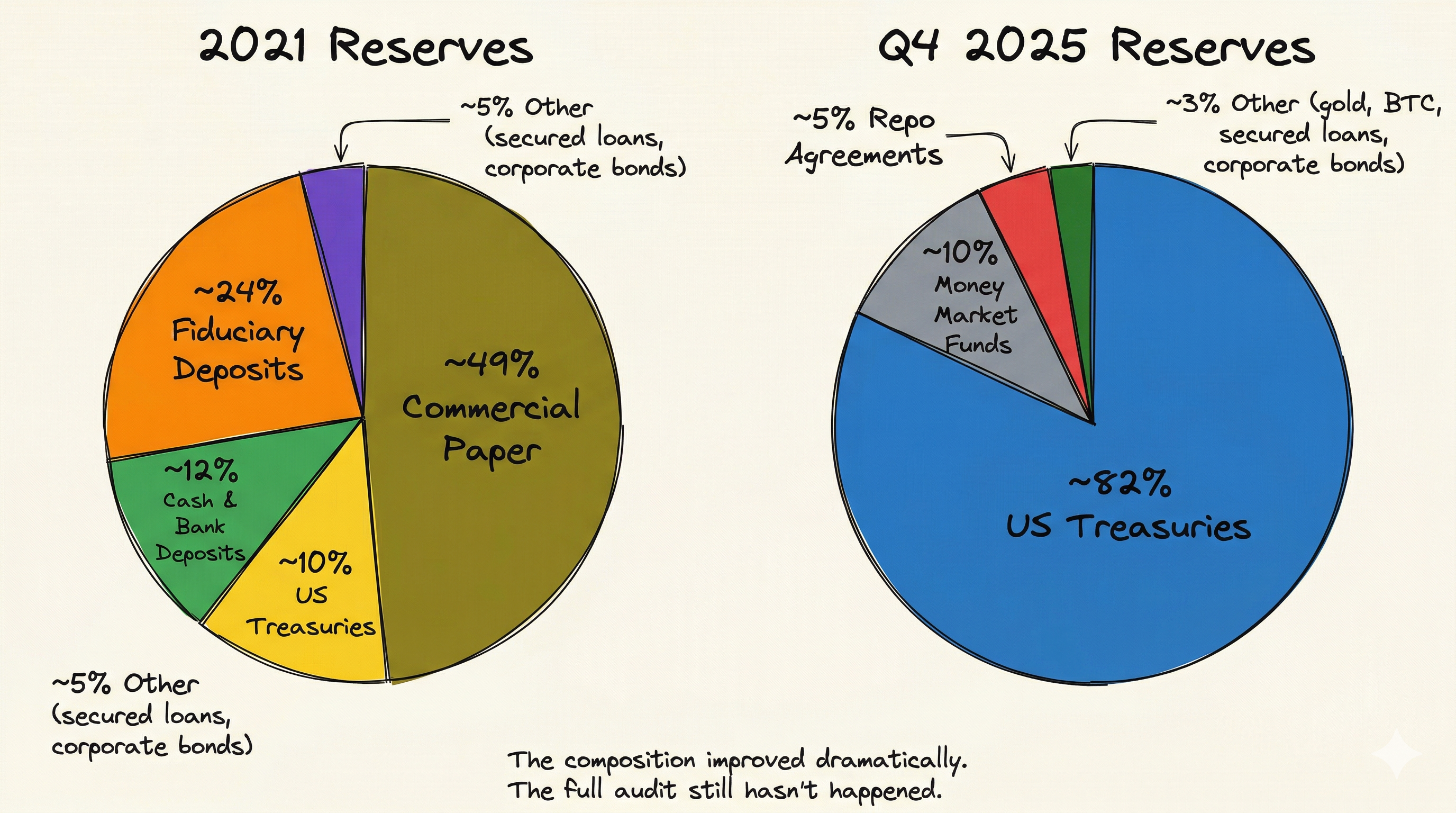 The reserve composition tells its own story. Based on the attestation and supplementary disclosures, approximately 82% US Treasuries, 10% money market funds, 5% repo agreements, with the remainder in gold, Bitcoin, secured loans, and corporate bonds.