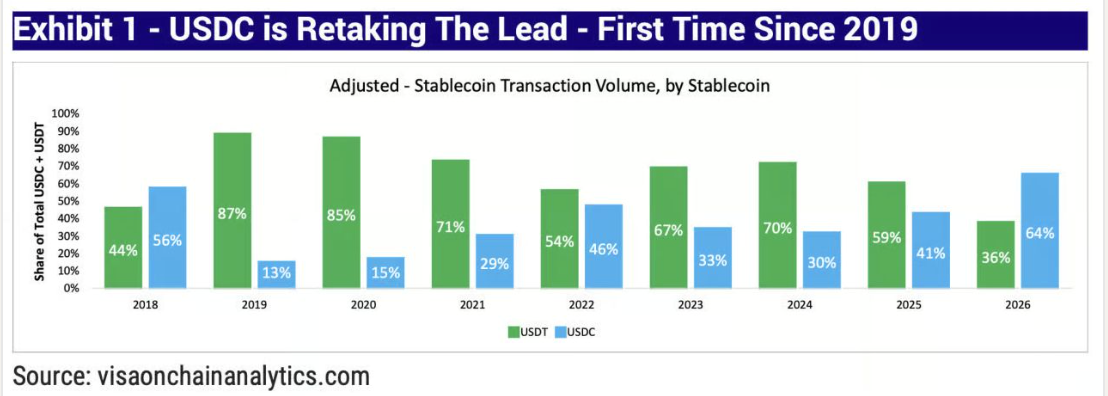The competitive picture with Circle is more nuanced than either side admits. In adjusted transaction volume, USDC has now overtaken USDT for the first time since 2019. Visa’s onchain analytics show the reversal: USDT’s share of stablecoin transaction volume went from 87% in 2019 to 36% in 2026. USDC went from 13% to 64%. Institutions, AI agents, payment providers, and DeFi protocols are choosing USDC. Circle is publicly listed on the NYSE and has regulatory clarity in the US. USDC’s supply grew 73% in 2025 versus USDT’s 36%.